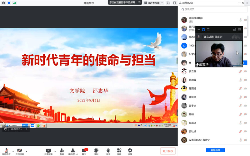 适逢五四青年节,5月4日下午,百家乐规则 通过腾讯会议举办“新时代青年的使命与担当”专题党课教育。本次党课由百家乐规则 党委宣传委员邵志华教授主讲。