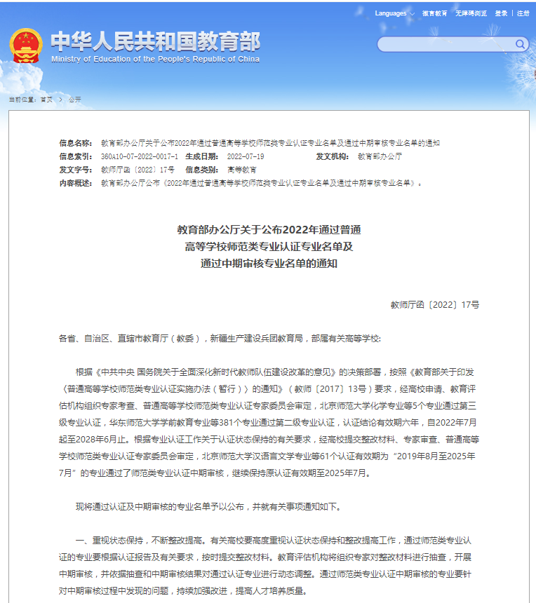 汉语言文学(师范)专业通过教育部师范类专业第二级认证(教师厅函〔2022〕17号)