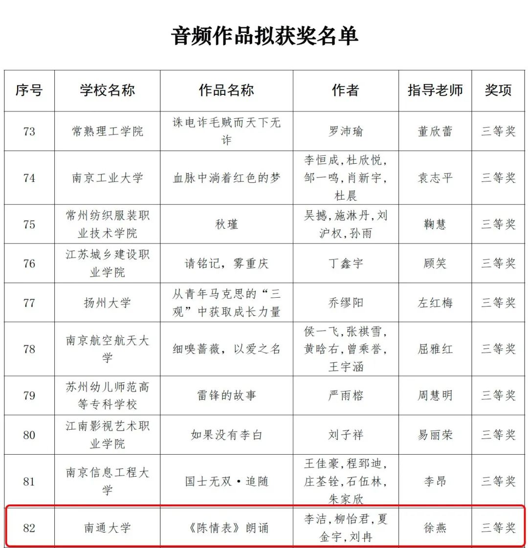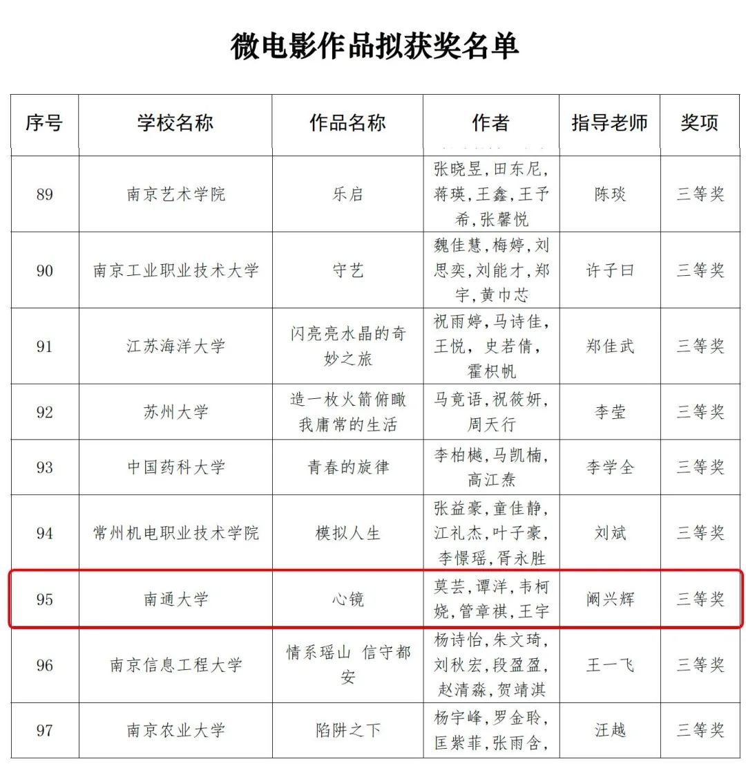 近日,江苏省委教育工委、江苏省教育厅公布了2023年江苏省大学生网络文化节和高校网络教育优秀作品推选展示活动遴选结果。经过高校申报、材料初审、专家评审,百家乐规则 共三项作品在江苏省大学生网络文化节中取得佳绩,微视频作品《中国人物—雷锋》荣获微视频类三等奖,微电影作品《心镜》荣获微电影类三等奖,音频作品《陈情表》荣获音频作品类三等奖。