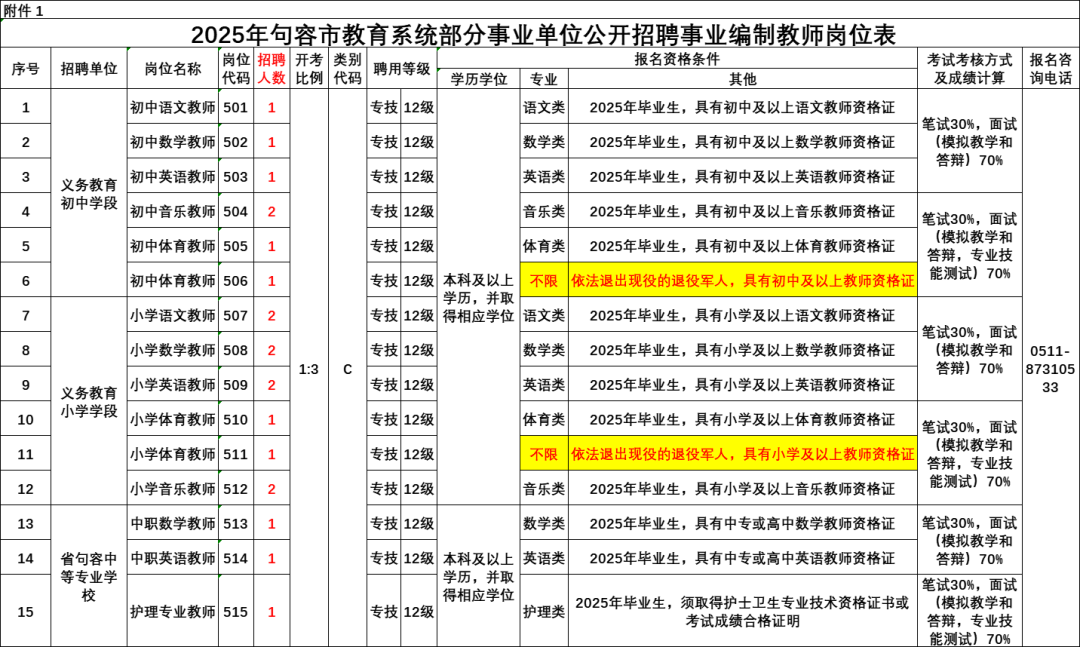 (七)招聘岗位、人数和所要求的学历、专业等资格条件详见附件《2025年句容市教育系统部分事业单位公开招聘事业编制教师岗位表》(附件1,下简称《岗位表》),专业条件参照《2025年句容市教育系统部分事业单位公开招聘事业编制教师专业参考目录》(附件2);